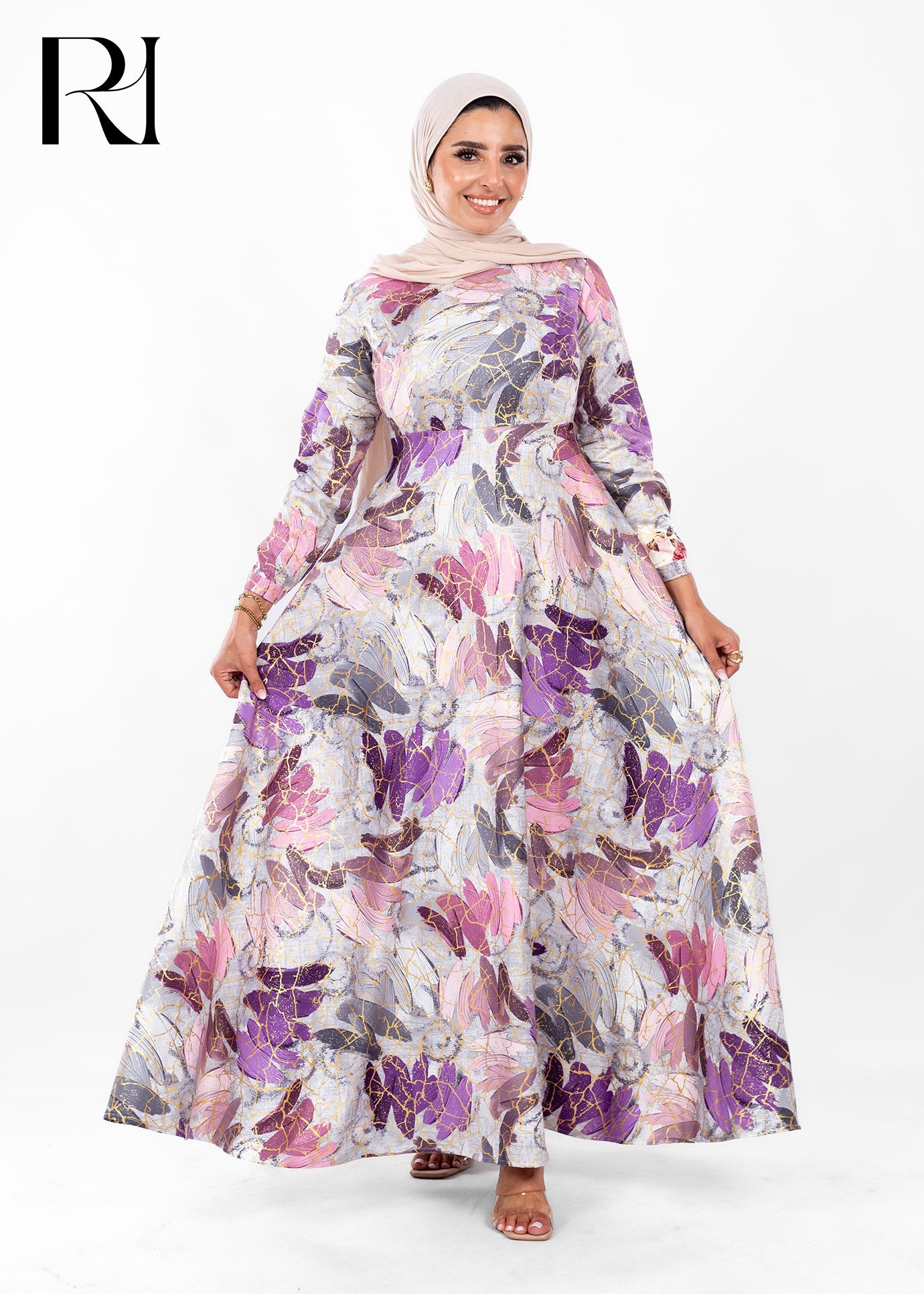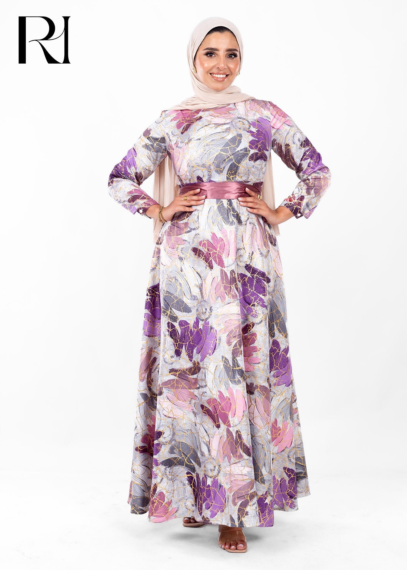 Short Description A regal maxi dress designed with a soft lilac-grey base adorned in shimmering purple, pink, and metallic gold floral accents. Featuring a concealed back zipper and a detachable satin belt that ties at the back, this piece combines sophistication with modest grace.