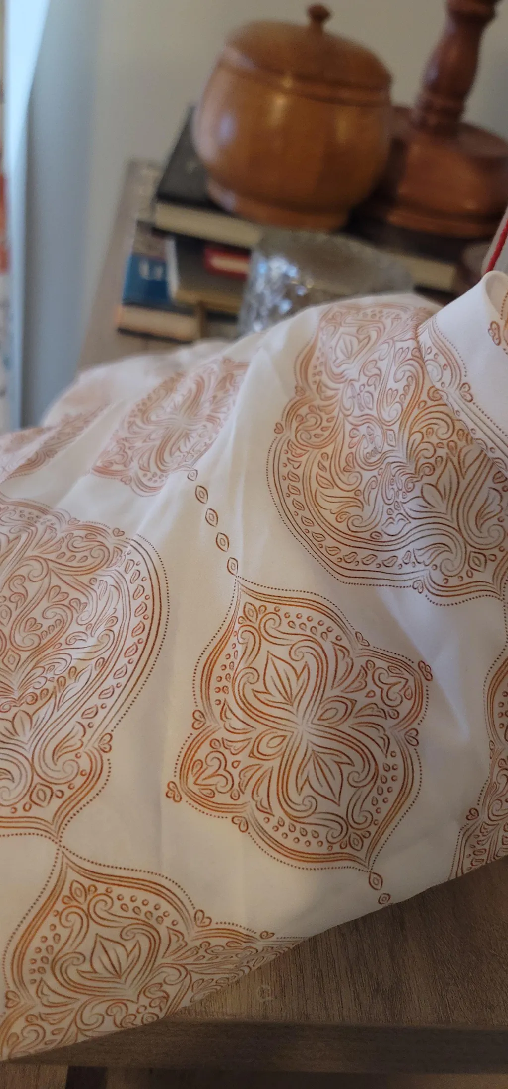 • Color: Ivory with peach and deep-toned ornamental print