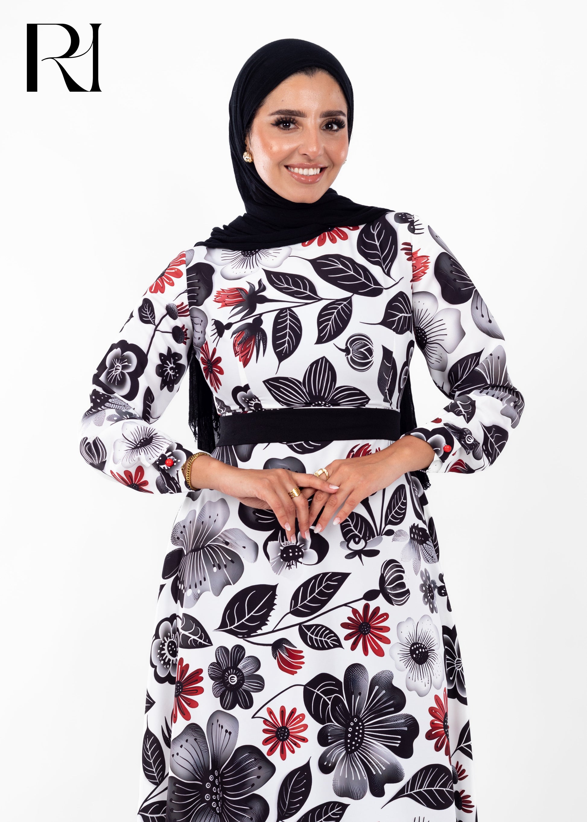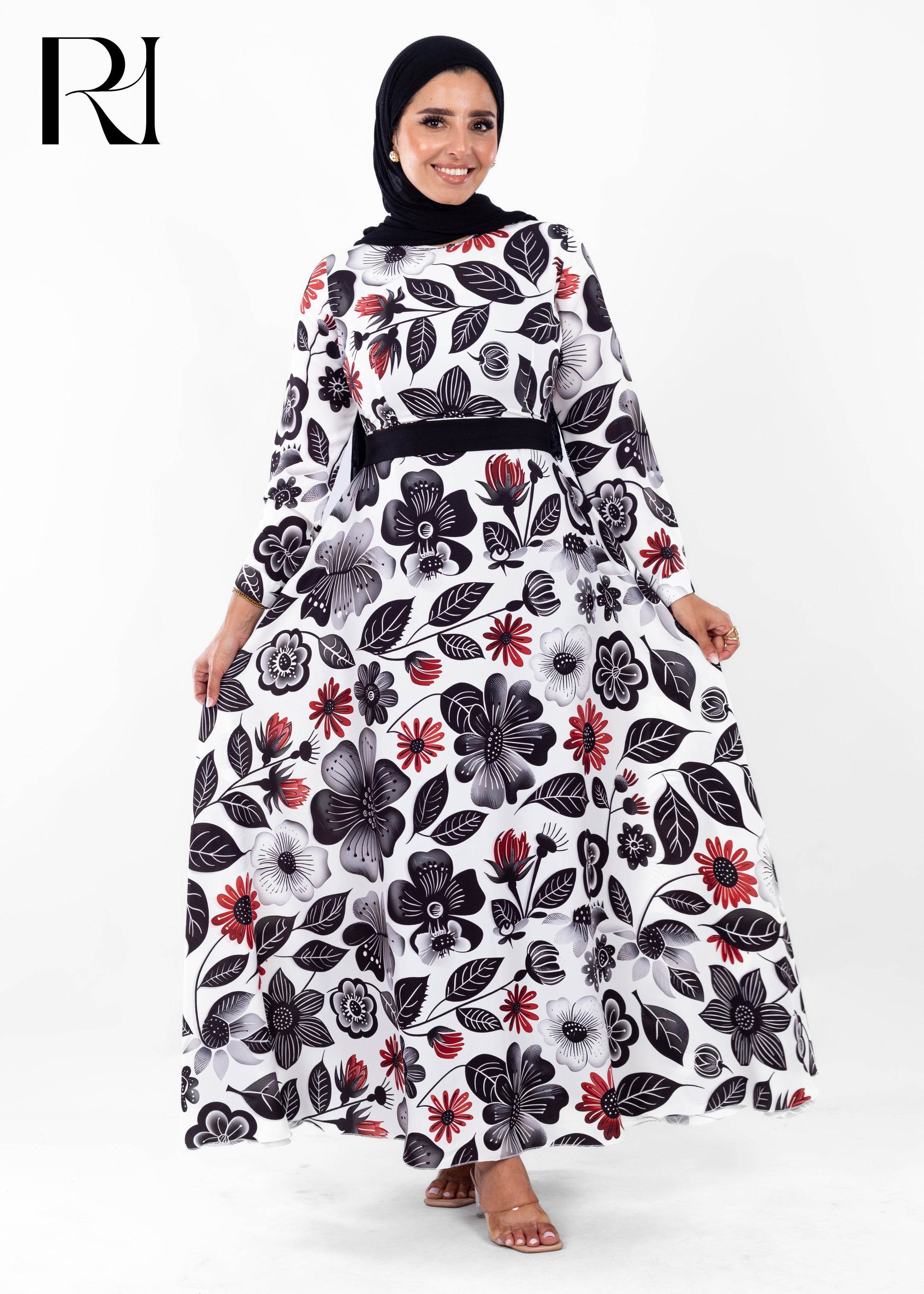 A striking maxi dress crafted from premium Rosaline fabric, featuring bold black and red floral prints over a crisp white base. Designed with a concealed back zipper and full-length sleeves, it blends sophistication with modest elegance.