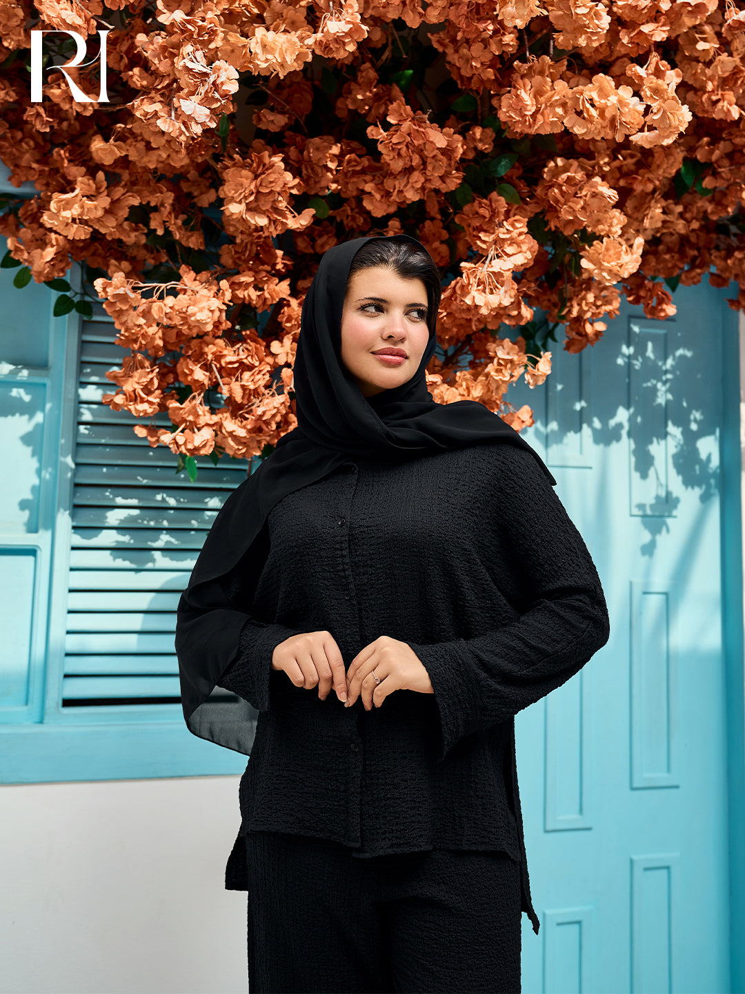 Timeless, versatile, and effortlessly chic this black textured co Ord set redefines everyday elegance. Designed with modest sophistication in mind, it’s the perfect balance between comfort and contemporary style.