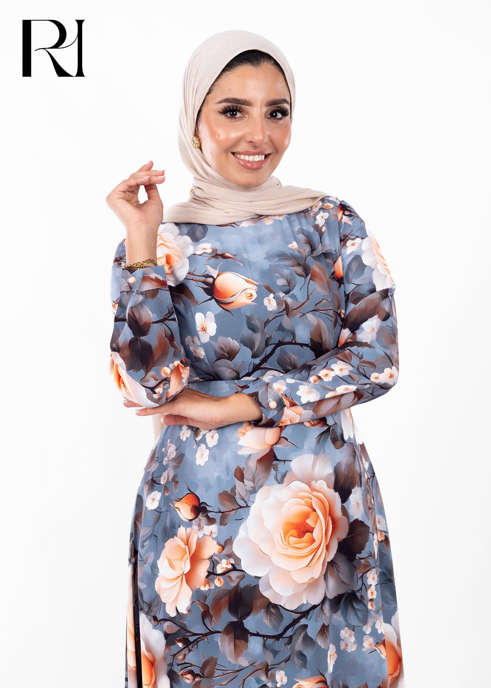 A graceful maxi dress adorned with oversized peach rose blossoms against a soft smoky grey base. With its long sleeves, flowing silhouette, and concealed back zipper, it combines timeless elegance with modest sophistication.