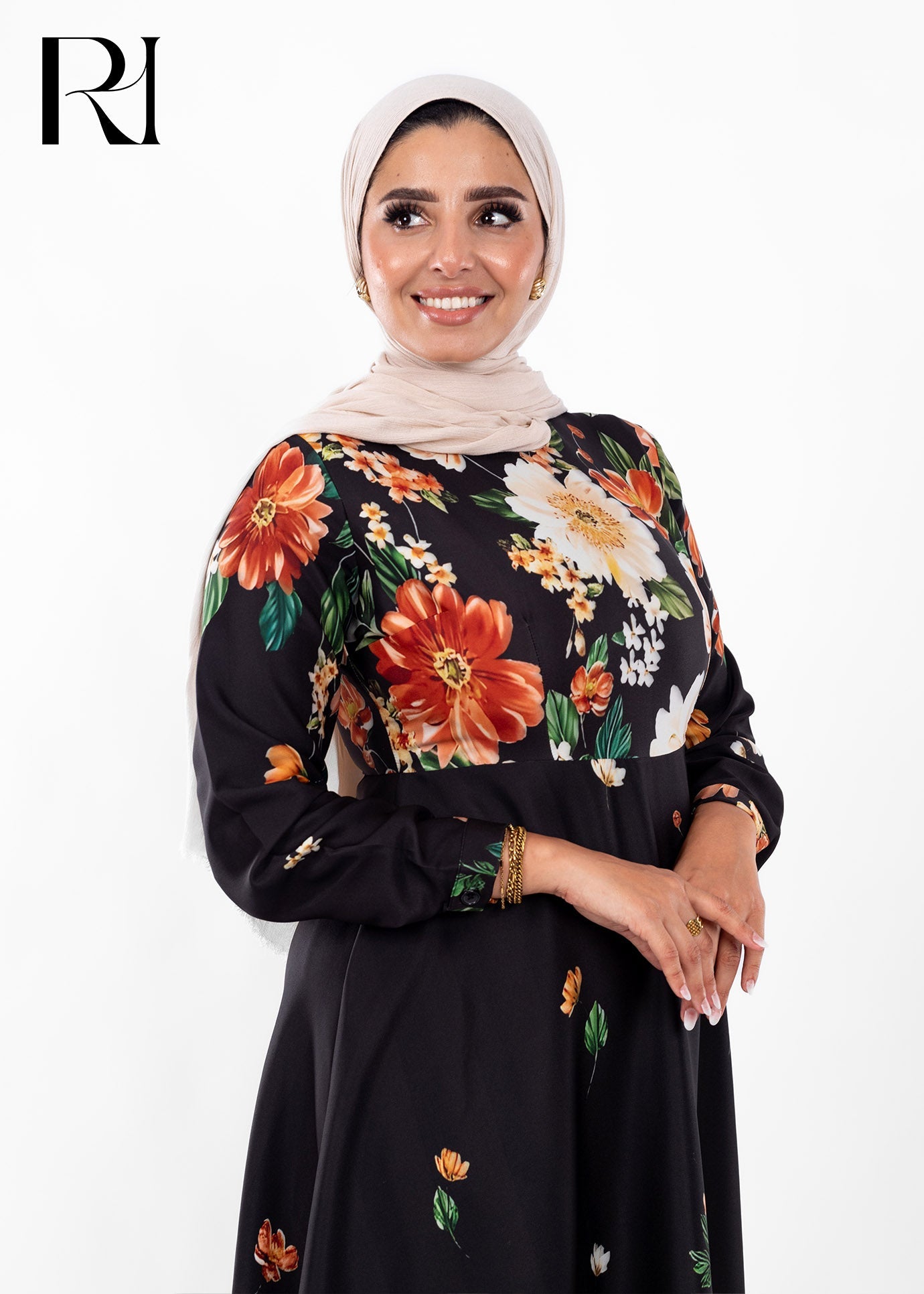 A graceful black maxi dress adorned with bold floral prints in shades of orange, ivory, and green. Designed with a concealed back zipper and full-length sleeves, it brings timeless elegance with a modern modest touch.